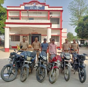 जिले में उचित व्यवस्था के लिए पुलिस अधीक्षक के चलाएं जा रहे अभियान के क्रम में व अपर पुलिस अधीक्षक व क्षेत्राधिकारी नानपारा मिहींपुरवा के निर्देश में थाना प्रभारी के नेतृत्व में गठित टीम थाना प्रभारी मुर्तिहा गणनाथ प्रसाद उप निरीक्षक राजकुमार यादव, उप निरीक्षक सुशील कुमार, हेड कांस्टेबल जयप्रकाश यादव, कांस्टेबल दीपक कुमार, कांस्टेबल कमलेश कुमार कनौजिया, कांस्टेबल विनय कुमार, कांस्टेबल वरुण कुमार द्वारा क्षेत्र भ्रमण के दौरान मुखबिर खास की सूचना पर परसीपुरवा चौराहा व बभनिया फांटा जंगल से कुल छ:अदद मोटरसाइकिल के साथ विजय कुमार पुत्र कोमल कुमार निवासी राजापुर कतर्निया थाना मोतीपुर व भागीरथ पुत्र स्वर्गीय रामसेवक गुप्ता निवासी रमतलिया दाखिला मधवापुर थाना कोतवाली मुर्तिहा को गिरफ्तार किया गिरफ्तार दोनो आरोपियों पर धारा ४१/४११/३४ भा०द०वि० में विधिक कार्यवाही की गई।