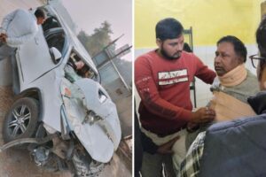 ओवरलोड ट्रैक्टर मय ट्रॉली सहित तेज रफ्तार से पीछे से मोटरसाइकिल सवार एक शिक्षक और …