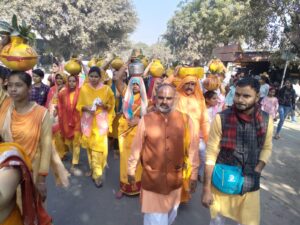 बदायूं कस्वा म्याऊ में सात दिवसीय श्री मद भागवत कथा प्रारम्भ होने से पहले कलश यात्रा बैन्डवाजो के साथ कस्वे के मुख्य मार्गो से होकर शिव मन्दिर पर पहुच कर प्रसाद वितर०ा किया गया ।कलश यात्रा ग्रामवासियो ने पुष्पबर्षा की गयी।