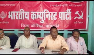 बाराबंकी। भारतीय कम्युनिस्ट पार्टी की एक अतिआवश्यक बैठक पार्टी कार्यालय में हुई जिसमें बोलते हुए राज्य कौंसिल सदस्य रणधीर सिंह सुमन ने कहा कि राम काज कीन्हें बिनु, मोहि कहां विश्राम-माननीय मुख्यमंत्री का नारा है कि माफिया को मिट्टी में मिला देगें। शहर में स्थानीय निकाय चुनाव में एक प्रत्याशी के ऊपर चवालिस से अधिक मुकदमें है बाबा जगजीवन दास पार्क बाबा बैजनाथ उद्यान डिग्री कालेज लायब्रेरी बस स्टैंड टेम्पो स्टैंड की बेशकीमती जमीन को काम्प्लेक्स बनाकर बेचने का प्रयास करने वालों को चुनाव में असफल करें। जिला प्रशासन से अपील है कि चुनाव शान्ति पूर्ण तथा मतगणना पारदर्शी कराने की व्यवस्था करें। बैठक में पार्टी के जिला सचिव बृजमोहन वर्मा सह सचिव शिवदर्शन वर्मा राज्य कौंसिल सदस्य प्रवीण कुमार किसान सभा अध्यक्ष-विनय कुमार सिंह मो कदीर नैमिष कुमार सिंह मुनेश्वर आदि प्रमुख कम्युनिस्ट नेता मौजूद थे ।