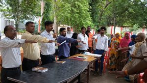 अयोध्या – आजादी का अमृत महोत्सव के समापन समारोह के अन्तर्गत “मेरी माटी, मेरा देश” एवं “हर घर तिरंगा अभियान” का सम्पूर्ण देश में उत्साही ढंग से आयोजित किया जा रहा है।इसी क्रम में आज मवई ब्लाक में क्षेत्रीय युवा कल्याण अधिकारी ललित तिवारी व ग्राम पंचायत सचिव अंकुर यादव द्वारा मवई ब्लाक परिसर में अधिकारियों/कर्मचारियों व ग्रामीणों को अमृत काल के पंचप्रण 1. विकसित भारत का लक्ष्य 2. गुलामी के हर अंश से मुक्ति 3. अपनी विरासत पर गर्व 4. एकता और एकजुटता 5. नागरिको में कर्तव्य की भावना, की शपथ दिलाई गई।इस मौके पर एडीओ पंचायत विजय पासवान, ग्राम सचिव अंकुर यादव, प्रधान खिताबुल निशा एवं प्रधान प्रतिनिधि अब्बास, मस्तान, प्रदीप, बीएमएम संजय, भारतीय किसान यूनियन के सदस्य एवं अन्य सम्मानित ग्रामवासी मौजूद रहे।