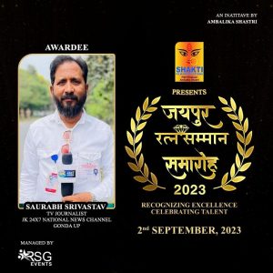गोंडा ।। समाज के लिए कुछ ना कुछ करते रहना आवश्यक है। साथ ही आवश्यक है उन लोगों का सम्मान जो इस समाज तथा देश को समर्पित होकर श्रेष्ठ कार्य कर दूसरों से अलग अपनी पहचान बनाते हैं। इन्हीं भावों को लेकर शक्ति फिल्म प्रोडक्शन हरवर्ष की भांति इस वर्ष भी जयपुर रत्न सम्मान समारोह निर्मला एडोटोरियम का चतुर्थ संस्करण आयोजित किया गया इस समारोह में समाज के विभिन्न क्षेत्रों में समर्पित भाव से श्रेष्ठ कार्य करने वाली गणमान्य विभूतियों में हमारे जेके 24×7 न्यूज के गोंडा संवाददाता सौरभ श्रीवास्तव को भी सम्मानित किया गया शक्ति फिल्म प्रोडक्शन की फाउंडर अंबालिका शास्त्री ने कार्यक्रम की जानकारी देते हुए बताया कि “जयपुर रत्न सम्मान समारोह” का चतुर्थ संस्करण आज जयपुर में रंगारंग प्रस्तुतियों के साथ आयोजित किया गया जिसमें समाज में उत्कृष्ट कार्य करने वाली प्रतिभाओं को तरासकर उन्हें अलग व विशिष्ट पहचान प्रदान की गई इस कार्यक्रम में सम्मान समारोह के साथ ही विभिन्न मॉडलों द्वारा डिजाइनर शोकेसिंग व एनजीओ के अनाथ बच्चों द्वारा फैशन वॉक किया गया