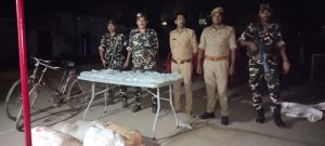 बीते रात दिनांक 27 सितंबर 2023 को समय लगभग 19:00 बजे 42वीं वाहिनी सशस्त्र सीमा बल बहराइच-। के सीमा चौकी शिवपुरा के द्वारा उप कमांडेंट अनिल कुमार यादव के निर्देशन में उ०प्र० पुलिस व सीमा चौकी शिवपुरा के कार्मिकों द्वारा संयुक्त गश्त निकाली गई। गश्त के दौरान सीमा स्तम्भ संख्या 654/01 के समीप 15 मीटर भारतीय क्षेत्र में कुछ दूरी पर गश्ती दल द्वारा नेपाल से भारत की तरफ 02 अंजान युवकों को साइकिल पर लदी प्लास्टिक की भरी बोरी के साथ भारत की तरफ आते हुए देखा गया। अचानक गश्त दल को देखते ही दोनो संभावित अभियुक्त अपनी साइकिल पर लदी भरी बोरी को उसी स्थान पर फेंक कर नेपाल की तरफ भागने लगे। गश्ती दल के द्वारा संभावित अभियुक्तों को पकड़ने का काफी प्रयास किया गया परंतु जब तक वे नेपाल में दाखिल हो गए मौके पर गश्ती दल के द्वारा भरी बोरी को चेक किया गया जिसमे से कुल 195 पैकेट कच्ची नेपाली शराब और 2 साइकिल बरामद किया गया बरामद कच्ची शराब व 2 साइकिल को सभी आवश्यक औपचारिकता विधिवत रूप से पूर्ण करने के उपरांत पुलिस थाना रूपईडीहा जनपद बहराइच को अग्रिम कार्रवाई हेतु सुपुर्द कर दिया गया। गश्ती दल में एसएसबी के सहायक उप निरीक्षक अरुण कुमार, मुख्य आरक्षी वीर सिंह सैनी, आरक्षी भूपेंद्र विस्ट, मुकेश कुमार, प्रवीण कुमार, ऊ.प्र. पुलिस के उप निरीक्षक अश्वनी कुमार पाण्डेय,आरक्षी जतिन कुमार, आरक्षी शशांक कुमार शामिल रहे। 42वी वाहिनी सशस्त्र सीमा बल बहराइच-। के कमांडेंट गंगा सिंह उदावत के द्वारा बताया गया की भारत नेपाल सीमा पर बढ़ते अवैध शराब की तस्करी की रोकथाम के लिए हमारे जवानो द्वारा 24 घंटे सीमा पर चौकसी बरती जा रही है, तथा बताया गया की शराब से न केवल मनुष्य के शरीर बल्कि उसका पैसा,परिवार,पारिवारिक सुख चैन सभी का नुकसान होता है, इसको पूर्ण रूप से लगाम लगाने के लिए जनता से अपील की गई की शराब की अबैध तस्करी, बिक्री,निष्कर्षण पर रोक लगाने के लिए नेपाल सीमा पर तैनात एसएसबी को अधिक से अधिक सहयोग दे।
