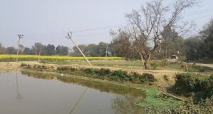 अयोध्या 18 फरवरी – 11 हजार केवी लाइन का विद्युत पोल गिरने की कगार पर, विभाग की देखने को मिल रही बड़ी लापरवाही,