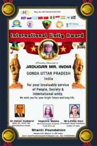 इस बावत इंटरनेशनल मैजिशियन जादूगर मिस्टर इंडिया ने बताया कि शांति फाउंडेशन के तत्वावधान एवं कनाडा एवं साउथ अफ्रीका की निर्णायक टीम के नेतृत्व में आयोजित दस देशों के यूनिटी कम्पटीशन के दौरान विजेता घोषित किये जाने पर उन्हें यह एवॉर्ड प्राप्त हुआ। बताते चलें कि जादू की दुनिया मे अपनी जादुईकला के माध्यम से अपना अलग प्रदर्शन करते हुये एक अनोखी ख्याति प्राप्त कर इंटरनेशनल मैजिशियन जादूगर मिस्टर इंडिया ने तकरीबन डेढ़ सौ से भी अधिक एवॉर्ड प्राप्त करते हुये उत्तरप्रदेश सहित जिले व क्षेत्र का नाम रोशन किया।जनपद गोण्डा में गत 26 नवम्बर को शान्ति फाउंडेशन के बैनर तले आयोजित कार्यक्रम में प्रतिभाग कर अपनी जादुई कला का बेहतर प्रदर्शन किया। जिसमें शान्ति फाउंडेशन की प्रेसिडेंट पिंकी देवी तथा निर्णायक टीम मेम्बर कनाडा के डॉ0 केतन कुलकर्णी व साउथ अफ्रीका की ब्रांड अम्बेसडर बेजन्ती मक्का द्वारा विजेता चुने जाने पर इंटरनेशनल यूनिटी एवॉर्ड से नवाजे गये।