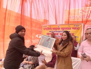 दिनांक–31जनवरी-2025 गोंडा गुरुनानक चौराहे पर परिवहन विभाग द्वारा राष्ट्रीय सड़क सुरक्षा माह समापन का कार्यक्रम आयोजित किया गया। कार्यक्रम के मुख्य अतिथि जिलाधिकारी श्रीमती नेहा शर्मा ने पहुंचकर कार्यक्रम में उपस्थित सभी अधिकारियों व कर्मचारियों एवं विद्यालयों के छात्र- छात्राओं को सड़क सुरक्षा नियमों का पालन करने हेतु सभी लोगों को शपथ दिलाया। इसके साथ ही जिलाधिकारी ने जनपद में सड़क सुरक्षा के संबंध में अच्छे कार्य करने वाले ट्राफिक इंस्पेक्टर एवं अन्य अधिकारियों कर्मचारियों को हेलमेट एवं प्रमाण पत्र देकर सम्मानित किया। इसी कार्यक्रम के दौरान जिलाधिकारी ने विद्यालय के छात्राओं को हेलमेट वितरित कर सड़क सुरक्षा नियमों का पालन करने के संबंध में जागरूक किया। उन्होंने कहा कि वाहन चलाते समय हम सभी लोगों को सड़क सुरक्षा नियमों का पालन करना अनिवार्य है, ताकि हम सभी का जीवन सुरक्षित रहे। वाहन चलाते समय सीट बेल्ट तथा हेलमेट का प्रयोग अनिवार्य रूप से किया जाए। कार्यक्रम के दौरान उन्होंने सभी लोगों को यह भी अवगत कराया कि वाहन चलाते समय मोबाइल फोन का प्रयोग कदापि ना किया जाय। कार्यक्रम के दौरान केमिस्ट एवं ड्रग एसोसिएशन के द्वारा विद्यालय के छात्राओं एवं अन्य लोगों को हेलमेट वितरित कर सड़क सुरक्षा नियमों का पालन करने का संदेश दिया।
