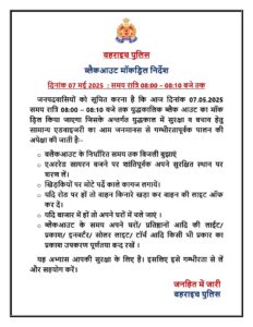 बहराइच, 7 मई 2025 — बहराइच पुलिस द्वारा आज दिनांक 07 मई 2025 को रात 08:00 बजे से 08:10 बजे तक युद्धकालीन ब्लैकआउट का मॉक ड्रिल आयोजित किया जाएगा। इस अभ्यास का उद्देश्य संभावित युद्ध या आपदा की स्थिति में नागरिकों की सुरक्षा एवं सजगता को परखना और बढ़ाना है।