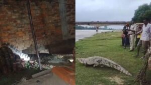नानपारा रेंज के ग्राम बेलवा भोपतपुर में सोमवार रात एक 15 फीट का मगरमच्छ अचानक ग्रामीण के घर में घुस गया, जिससे इलाके में हड़कंप मच गया। रात लगभग 1 बजे बफाती पुत्र सुलेमान के घर में घुसे मगरमच्छ की सूचना ग्रामीणों ने पुलिस को दी। जानकारी मिलते ही वन विभाग की टीम मौके पर पहुंची, लेकिन अंधेरा और भारी बारिश के कारण रेस्क्यू अभियान चुनौतीपूर्ण रहा। मगरमच्छ घर के शौचालय में छिपा हुआ था, जिसे पकड़ने में पूरी टीम को करीब 7 घंटे तक मशक्कत करनी पड़ी। सुबह 8 बजे आखिरकार वन विभाग की टीम ने मगरमच्छ को सुरक्षित पकड़कर ग्रामीणों की भीड़ के बीच गायघाट सरयू नदी में छोड़ दिया।