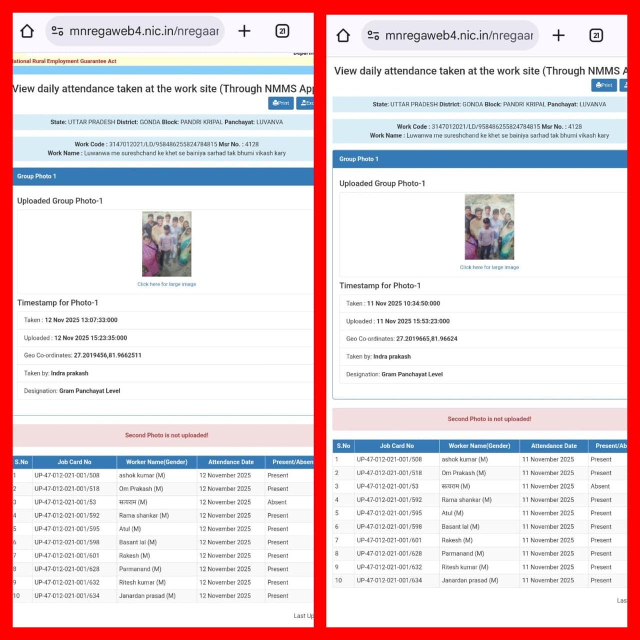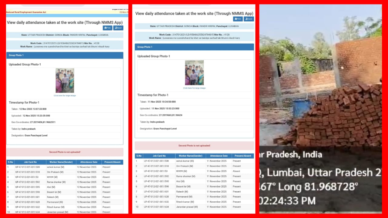 सबसे गंभीर अनियमितता मनरेगा में की गई है। मनरेगा अधिनियम 2005 के अनुसार उपस्थिति दर्ज करना पारदर्शी और वास्तविक होना चाहिए, लेकिन एक ही फोटो को 11 और 12 नवंबर 2025 सहित कई दिनों में बार-बार अपलोड कर फर्जी उपस्थिति दिखाई गई। यह धारा 25 मनरेगा कानून के तहत स्पष्ट रूप से दंडनीय धोखाधड़ी है।