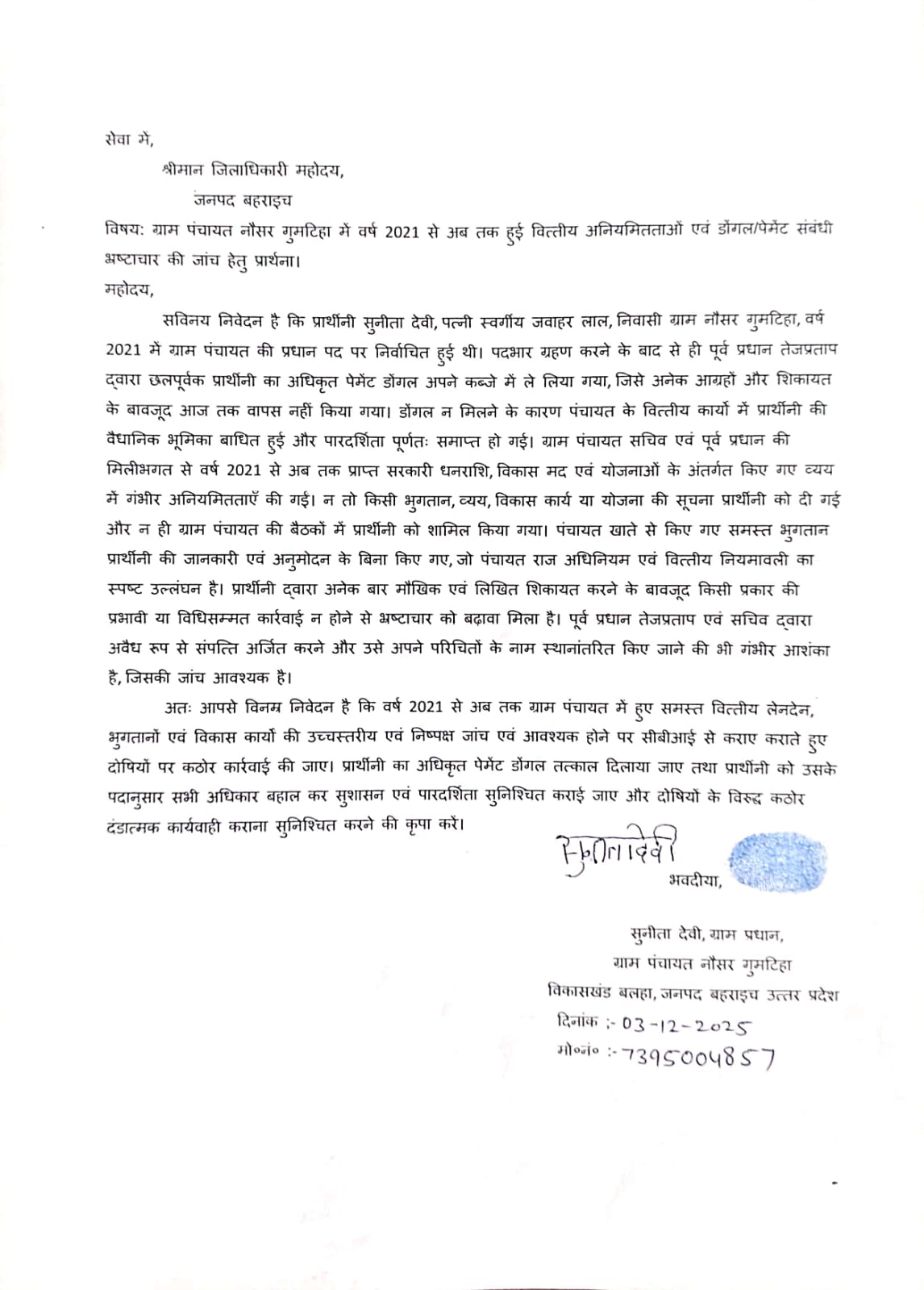जिला बहराइच के विकास खंड बलहा क्षेत्र के ग्राम पंचायत नौसर गुमटिहा की मौजूदा ग्राम प्रधान सुनीता देवी पत्नी स्वर्गीय जवाहर लाल ने वित्तीय अनियमितताओं और पेमेंट डोंगल से जुड़े भ्रष्टाचार को लेकर जिलाधिकारी बहराइच व खंड विकास अधिकारी बलहा को गंभीर शिकायत भेजी है। उन्होंने डाक, ऑनलाइन जनसुनवाई और सीधे BDO से मिलकर भी विस्तृत प्रार्थना पत्र दिया। पूर्व में शिकायत पर भी अब तक संतोषजनक कार्रवाई न होने पर वह बेहद नाराज हैं।