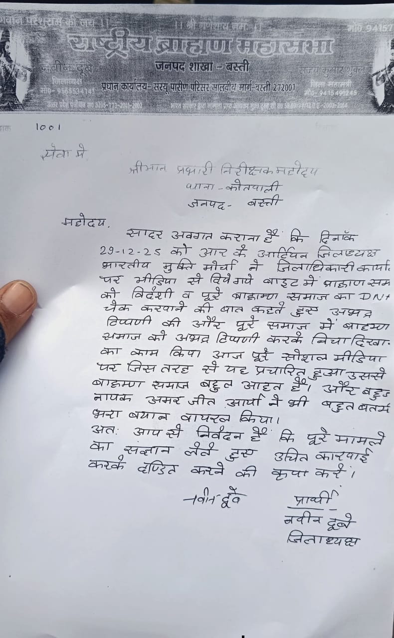 बस्ती । भारत मुक्ति मोर्चा जिलाध्यक्ष आर.के. आरटियन द्वारा ब्राम्हण समाज के विरूद्ध अपमानजनक भाषा का प्रयोग किये जाने से समाज के विभिन्न वर्गो में आक्रोश है। मंगलवार को राष्ट्रीय ब्राम्हण महासभा के प्रदेश अध्यक्ष प्रशान्त पाण्डेय, जिलाध्यक्ष नवीन दूबे के नेतृत्व में विभिन्न संगठनों के पदाधिकारियों, ब्राम्हण समाज के लोग तथा करणी सेना कोतवाली पर एकत्र हुये और आर.के. आरतियन के विरूद्ध लिखित तहरीर देकर मुकदमा दर्ज करने के साथ ही उसके तत्काल प्रभाव से गिरफ्तारी की मांग किया। कोतवाल ने आश्वासन दिया कि मुकदमा दर्ज कराकर शीघ्र गिरफ्तारी कराया जायेगा। इसके बाद राष्ट्रीय ब्राम्हण महासभा के पदाधिकारियों ने विभिन्न संगठनों के पदाधिकारियो के साथ जिलाधिकारी और पुलिस अधीक्षक को ज्ञापन सौंपा। मांग किया कि ब्राम्हण समाज के विरूद्ध अपमानजनक टिप्पणी करने वाले आर.के. आरतियन को गिरफ्तार कराया जाय। उच्चाधिकारियों ने प्रभावी कार्यवाही का आश्वासन दिया।