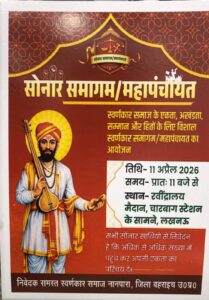 आगामी 11 अप्रैल को लखनऊ के रविंद्रालय मैदान में आयोजित होने वाली ‘सुनार समागम महापंचायत’ में अधिक से अधिक संख्या में प्रतिभाग करना।