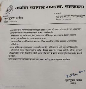 व्यापारिक प्रतिष्ठान अपनी दुकानों के सामने पेंट से स्वयं गोले बनवाएंगे। आधे स्टाफ के साथ काम करना होगा। स्टाफ व दुकान मालिक फेस मास्क व सेनेटाइजर का प्रयोग करेंगे। ग्राहक भी फेस मास्क व सोशल डिस्टेंसिंग का पालन करेंगे।