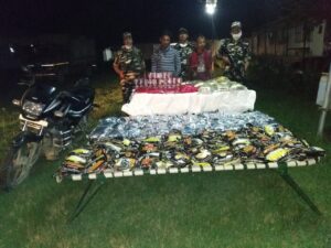 बहराइच- रुपईडीहा 42वी वाहिनी सशस्त्र सीमा बल के कमांडेंट प्रवीण कुमार ने बताया कि वाहिनी की सीमा चौकी मुंशी पुरवा के कमांडर को मुखबिर से सूचना मिली कि कुछ नशीला सामान अवैध रास्ते से भारत से नेपाल जाने वाला है। चौकी प्रभारी धर्मेंद्र कुमार मिश्रा ने मुखबिर की सूचना पर भरोसा करते हुए एक स्पेशल नाका पार्टी गठित कर जिसके कमांडर उपनिरीक्षक शैलेश कुमार, सहायक उपनिरीक्षक विक्रम चंद, राजेश कुमार व रोबिन कुमार को मुखबिर के द्वारा बताई हुई जगह पिलर संख्या 649/26 के पास भेज दिया। नाका पार्टी के जवान वहीं जंगलों में छुप कर बैठ गए। कुछ देर इंतजार करने के बाद देखा कि एक दो पहिया वाहन पर बोरियां लादकर दो व्यक्ति आ रहे हैं। नजदीक आने पर नाका पार्टी ने सामने आकर उन्हें रुकने को कहा जिससे वो घबरा गए और सामान व गाड़ी छोड़कर भागने लगे लेकिन नाका पार्टी के जवानों ने उन्हें दौड़ाकर पकड़ लिया तथा मौके पर बरामद बोरियों व व्यक्तियों की तलाशी लेने पर बोरियों में तंबाकू गुटखा आदि नशीला पदार्थ बरामद हुआ। सामानों के दस्तावेज मांगने पर देने से इनकार कर दिया अभियुक्त ने पूछताछ करने पर बताया कि यह सामान नेपाल पहुंचाने पर पांच ₹500-500 नेपाली मिलना था। अभियुक्त की पहचान (1)सलमान खान पुत्र जब्बार खान उम्र लगभग 24 वर्ष ग्राम निधि नगर संकल्प रूपईडीहा व (2) हसन अली पुत्र साबिर शेख उम्र लगभग 27 वर्ष ग्राम सभा पुरवा दुधवा नगर जनपद बांके नेपाल राष्ट्र के रूप में हुई है। कमांडेंट ने बताया बरामद सामान व मोटरसाइकिल को सीज कर के अभियुक्त सहित कस्टम नानपारा के सुपुर्द कर दिया गया है जिसकी कीमत ₹28190 आंकी गई है।