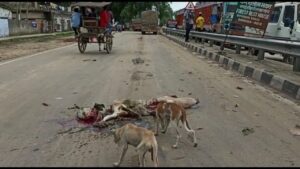 बहराइच- रुपाईडिहा में नेशनल हाईवे एनएच 927 पर माल वाहक ट्रक ने एक गाय को रौंदा डाला। जिस से गाय कि मौके पर ही मौत हो गई। यह घटना थाना रूटाईडिहा के कुछ ही दूरी पर हुआ। इस घटना कि जानकारी एसएसबी 42वी बटालियन के अधिकारियों को हुई तो यह जानकारी थाना रूपाईडिहा को दिया। लेकिन थाना रूपईडीहा का कोई भी कर्मचारी घटनास्थल पर नही पहुंचा। वहीं घटनास्थल पर ही मरी हुई गया पड़ी रही। और कुत्ते नोच रहे हैं। इस सम्बंध मे माल वाहक ट्रक के ड्राइवर ने बताया कि हम लोग ये ट्रक खड़ी करके सामान का कस्टम कराने गए थे। कस्टम होने के बाद ट्रक को नेपाल जाने की अनुमति मिलती है। अनुमति मिलने के बाद हम ट्रक को जैसे लेकर आगे बढ़े तो अचानक पता नहीं कहां से गाय आ गई ।