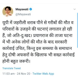 उन्होंने लिखा ‘प्रयागराज की ताजा घटना में भी अनेक लोगों की मौत के बाद सरकारी कार्रवाई उचित है, किंतु इस समस्या के समाधान के लिए दोषी अफसरों के खिलाफ सख्त कार्रवाई होनी बहुत जरूरी है. बता दें कि मथुरा, फिरोजाबाद, लखनऊ के बाद प्रयागराज में 6 लोगों की जहरीली शराब पीने से मौत हो चुकी है.