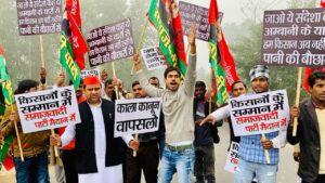 किसान बिल का विरोध कर रही समाजवादी पार्टी के राष्ट्रीय अध्यक्ष अखिलेश यादव के आवाहन पर समाजवादी पार्टी के एमएलसी राजेश यादव राजू ने फतेहपुर तहसील क्षेत्र के अमरसंडा गांव के निकट सैकड़ों गाय भैंसों के साथ किया अनोखा विरोध प्रदर्शन किया ।एमएलसी राजेश यादव राजू और उनके समर्थकों ने हाथों में तख्ती लेकर पैदल नारेबाजी करते हुए किसान बिल का विरोध करते हुए वापस लेने की मांग करते हुए सड़कों पर गाय भैंसो के साथ पैदल किया प्रदर्शन । राजेश यादव राजू ने कहा है कि भाजपा राज में जैसा अन्याय देश के अन्नदाता किसान के साथ आजाद भारत में कभी नहीं हुआ। लगातार एक पखवाड़े से खुले आसमान के नीचे ठण्ड में कांपते किसान सरकार से अपनी व्यथाकथा बताने को सड़क पर हैं लेकिन सरकार है कि उसके कान में जूं ही नहीं रेंग रही है। अपने मन की बात देश को जबरन सुनाने वाले किसान की कोई बात सुनने को तैयार नहीं है।